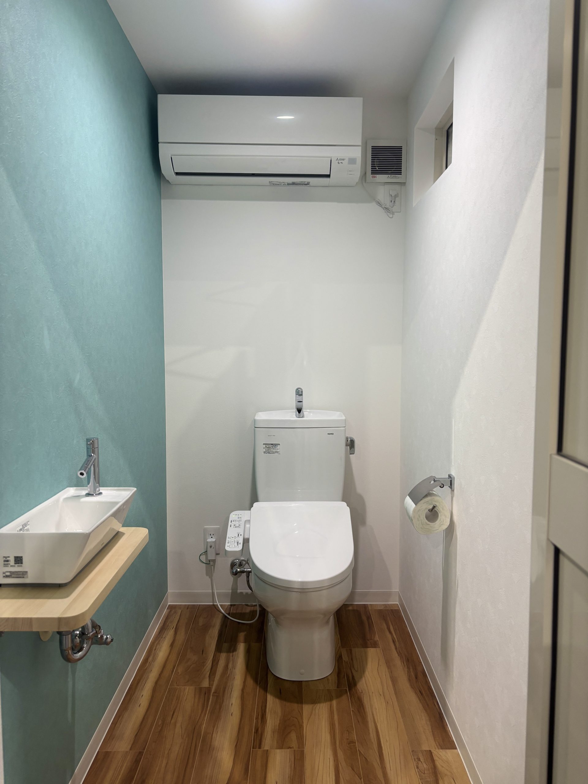トイレブースには水洗の洋式トイレ、手洗い器、エアコン