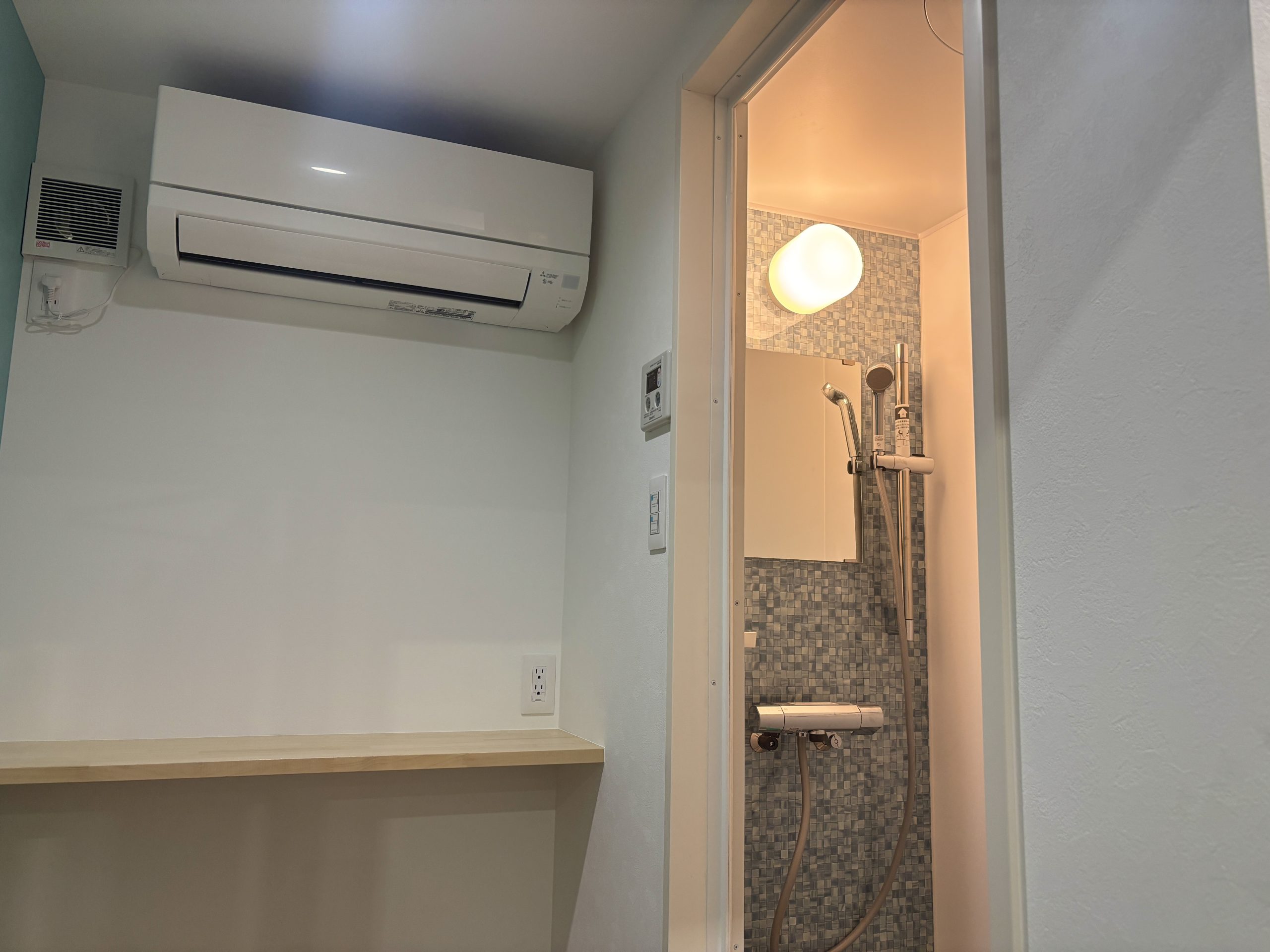 シャワーブースには脱衣スペースとカウンター、シャワーユニット、収納棚、エアコン