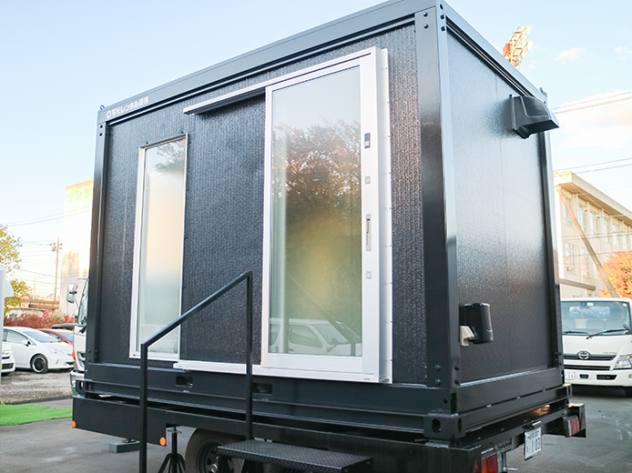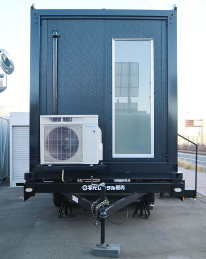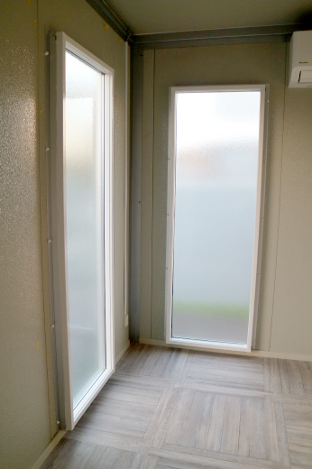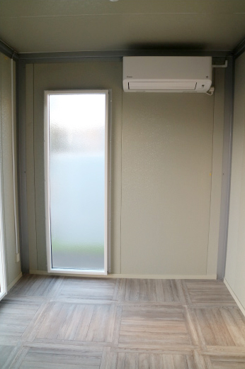 鉄骨構造 軽量形鋼・ノックダウン構造 屋根 ガルバリウム鋼板t=0.3mm 天井 両面カラー鋼板@0.3 断熱ウレタンパネル@40 壁面パネル 両面カラー鋼板@0.3 断熱ウレタンパネル@30 建具(ドア) アルミ框ドア(上部:透明ガラス3t・腰板:アルミ複合板4t) 建具(窓) アルミサッシ引違い(透明ガラス) 床 合板@15 仕上げ:PVCフロアシート 照明 FL40(36W×2灯用) 漏電ブレーカー 100V/20W コンセント 2口用 換気扇 ウェザーカバー付き 外線引込口 樹脂製 1F床面積 計算式:2.17×3.47=7.53㎡ エアコン オプション